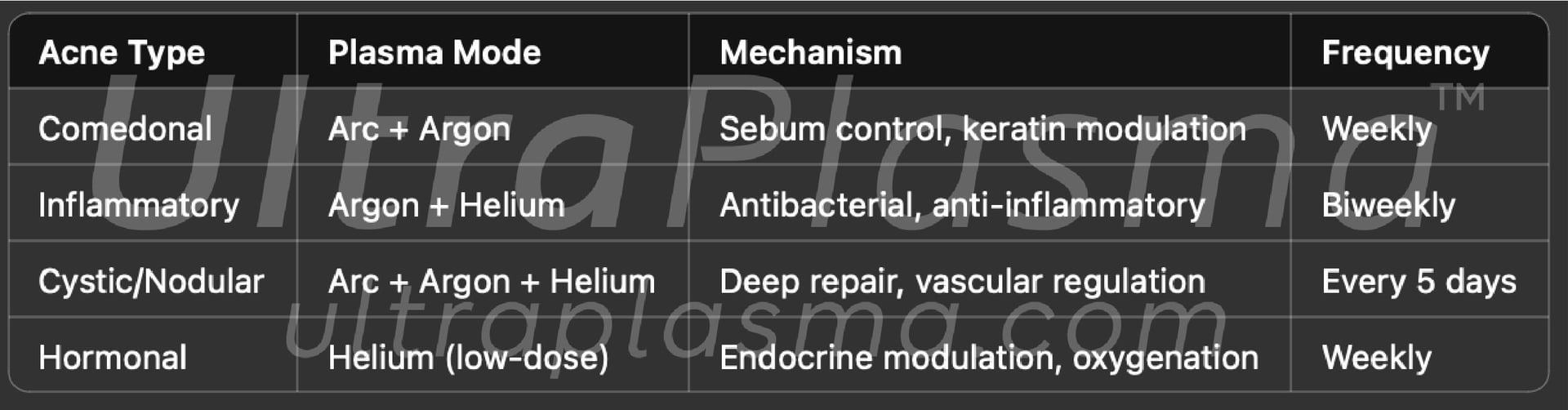 The UltraPlasma™ multi-platform plasma system represents a paradigm shift in the treatment of all acne types, offering a non-invasive, gas-modulated, and layer-specific therapeutic approach. By integrating arc, argon, and helium plasma emissions with an advanced software-defined spectral output, UltraPlasma™ delivers highly targeted effects across the epidermis, dermis, and hypodermis. The generation of controlled reactive gases such as ozone and nitric oxide enhances antimicrobial action, sebaceous regulation, and tissue regeneration, while simultaneously supporting microcirculation and immune modulation.